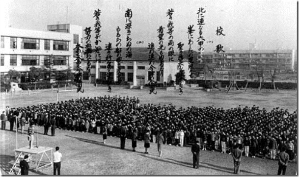 From Chuhei西宮市今津小学校の六角堂は、今は西宮の有名な名所となって学校の南表に移築されていますが、私の在校していた時は、奥まった校長室の隣の庭にありました。昭和12年の阪神電車久寿川駅南側の地図です。今津小学校、右の端に甲陽中学(今のノボテルホテルとダイエー甲子園店)があります。昔の福応神社、常源寺もあり、、赤丸のところに私の家がありました。昭和32年の今津小学校入学式の写真ですが、左側校舎で私は4年から6年生まで学んでいました。この写真は卒業後13年たっていますが、まだ在校時の雰囲気があり、校歌もこの頃までは、変わっていませんでした。(写真は今津いまむかし物語より)ただ戦時中は、この運動場の朝礼から一斉に東を向いて、皇居礼拝を毎日したものです。傘寿のラスト国民学校同窓会